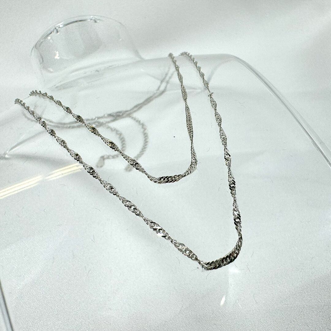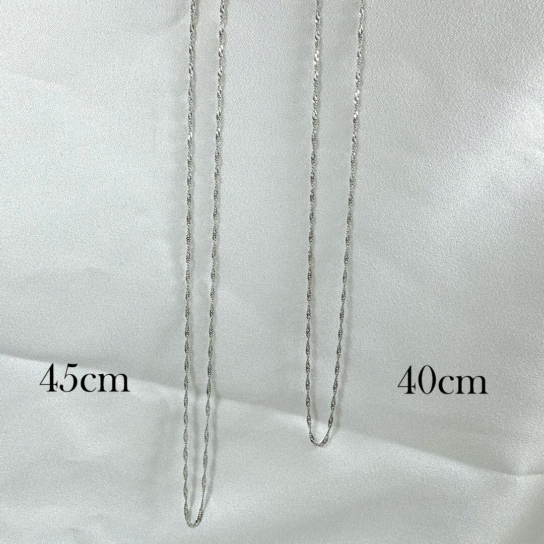 ゆるいらせん模様を描いたネックレス。細身のチェーンがしなやかに胸元のワンポイントアクセントを演出します。2種類の長さを選べるので、より可愛いらしさを見せたい場合は短めを選ぶのがおすすめです。