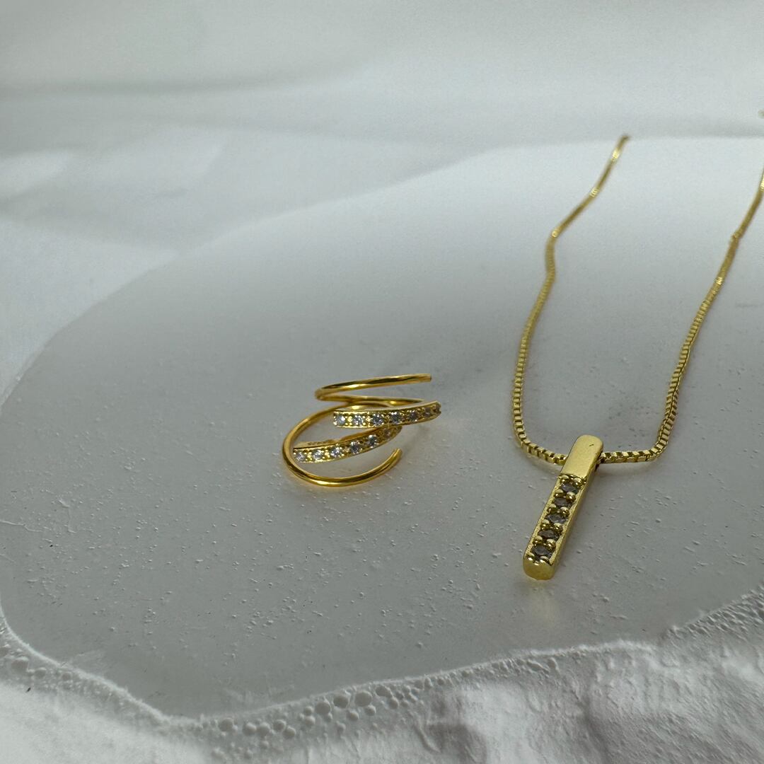ねじりを加えたフープにジルコンが上品に輝くピアスとネックレスがギフトポーチ付きのセットで販売です。