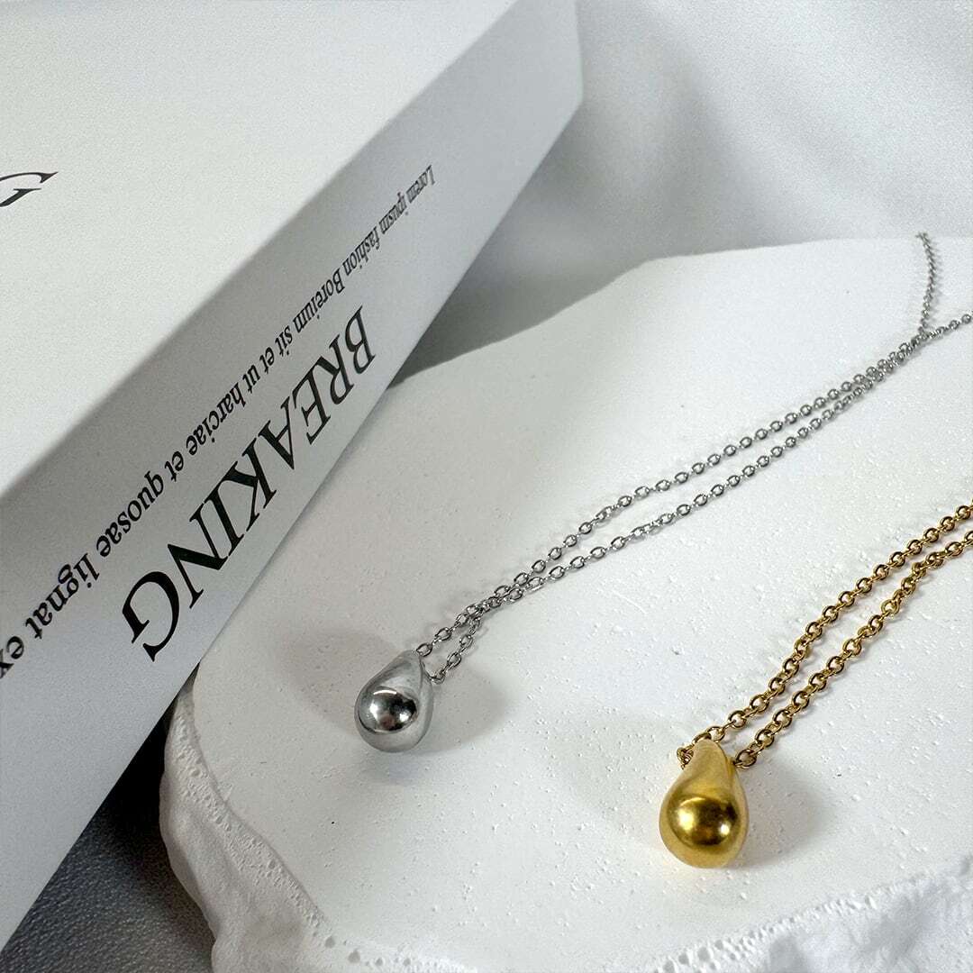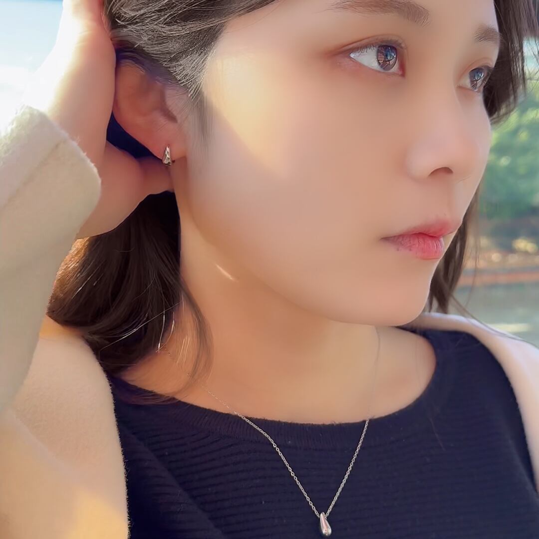 耳たぶにさりげなく収まるシンプルなミニピアスとドロップモチーフの曲線がどこか現代的な雰囲気を漂わすネックレスが、ギフトポーチ付きのセットで販売です。